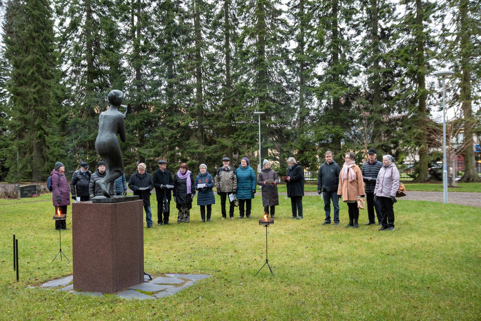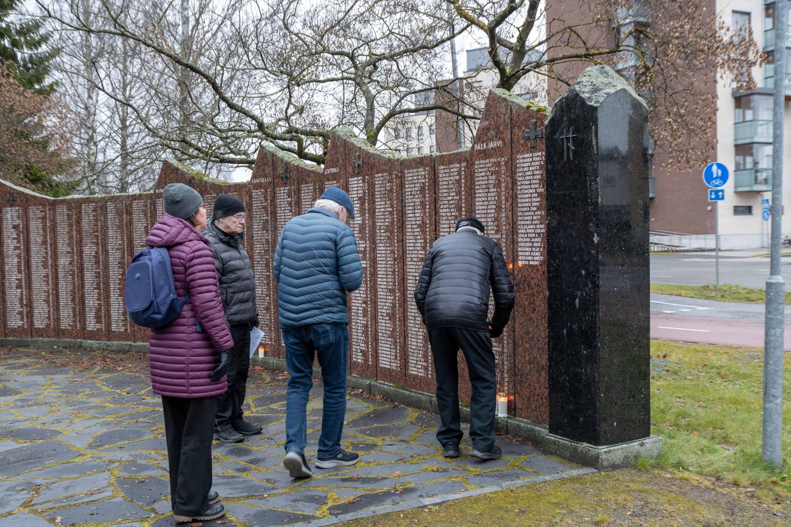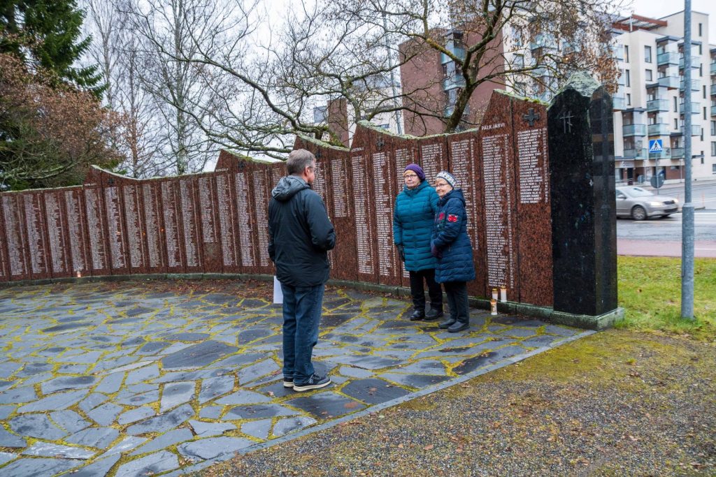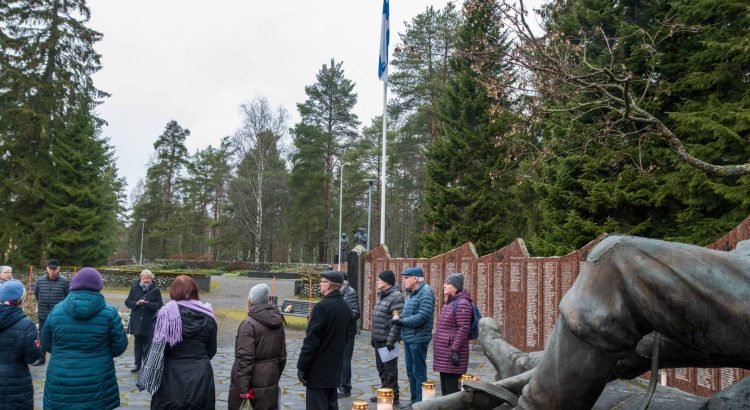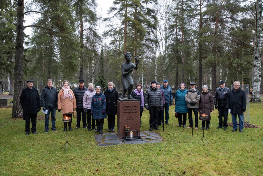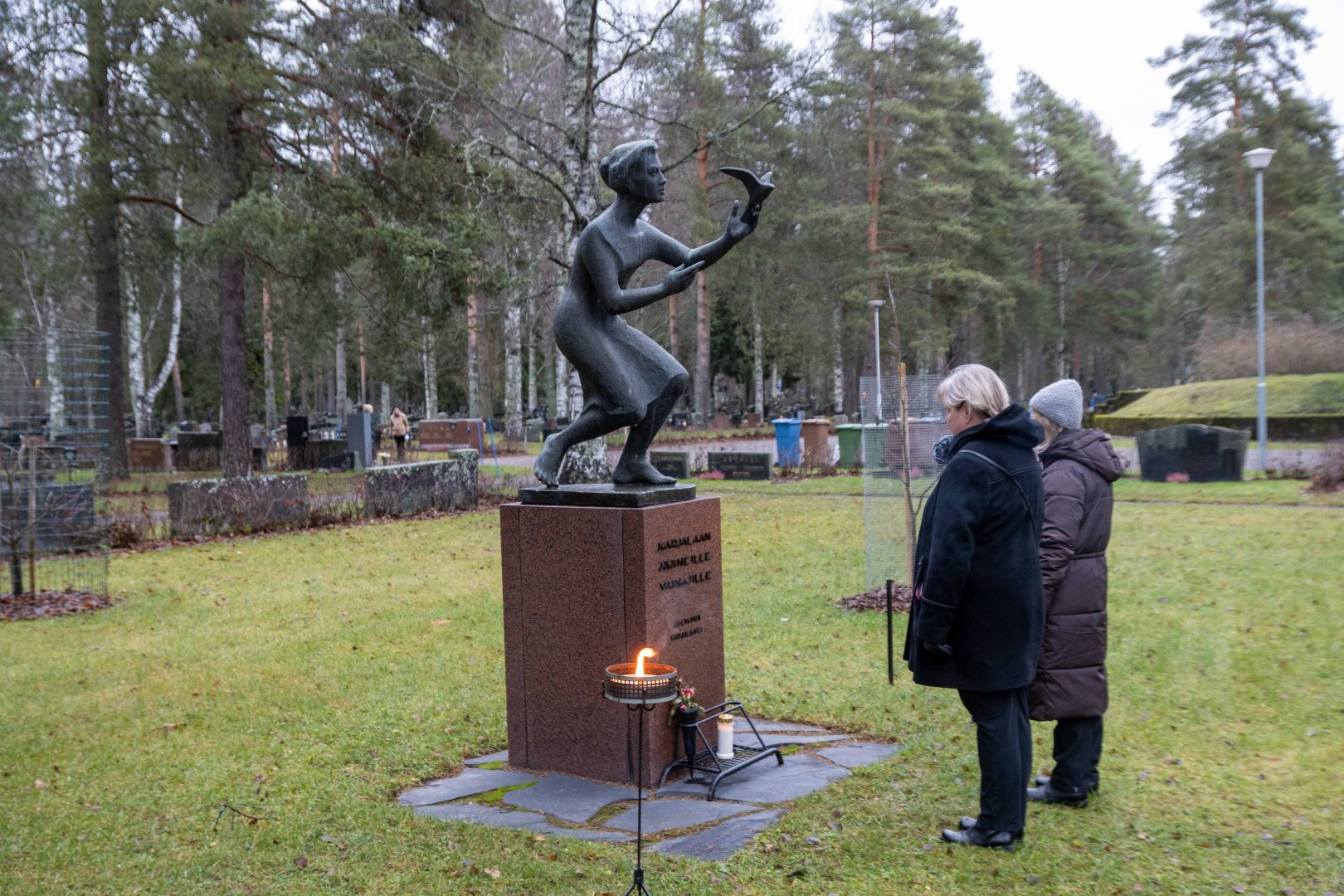 Karjalaan jääneiden patsalla sytytettiin kynttilä ja laulettiin virren 577 kolmas säkeistö.