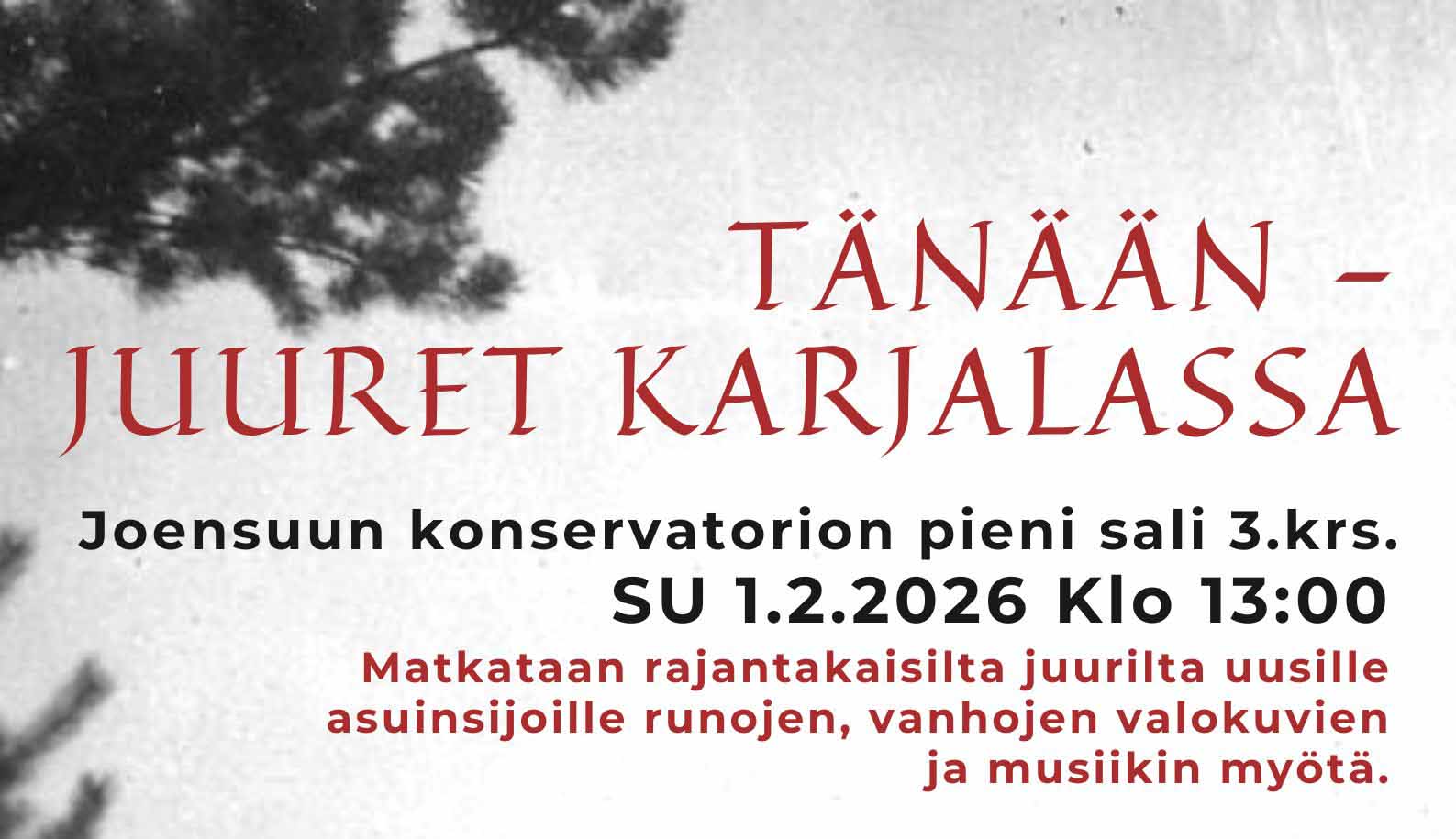 Tänään – juuret Karjalassa”- esitys sunnuntaina 1.2.2026 klo 13:00. Vapaa pääsy.