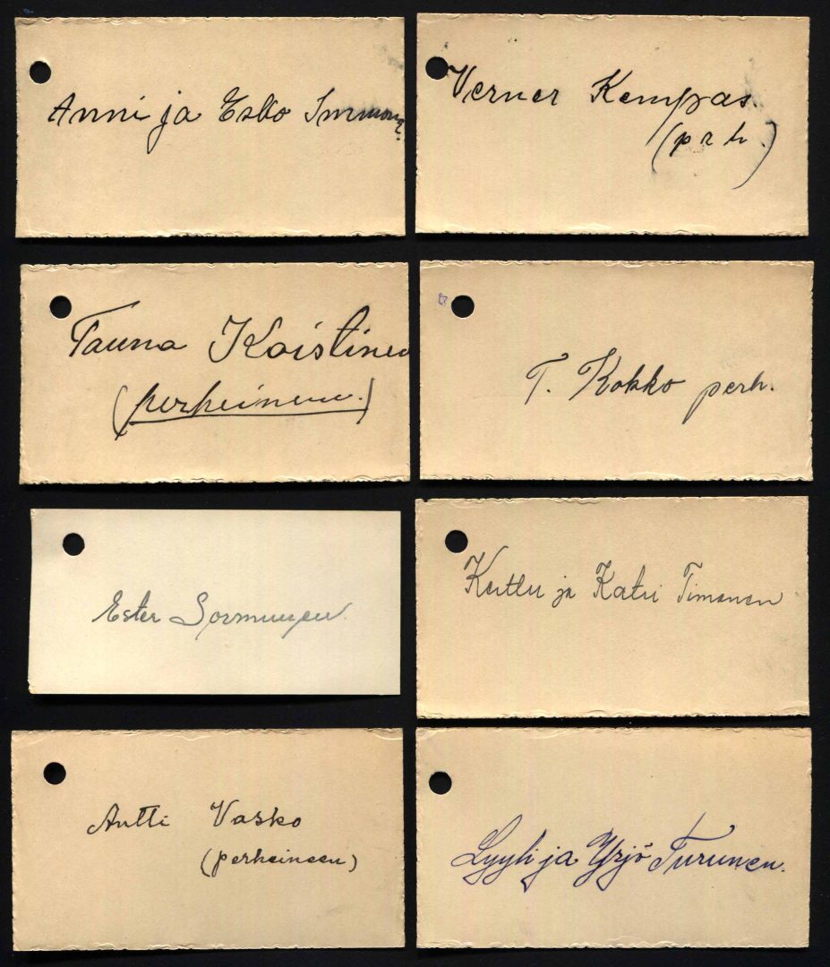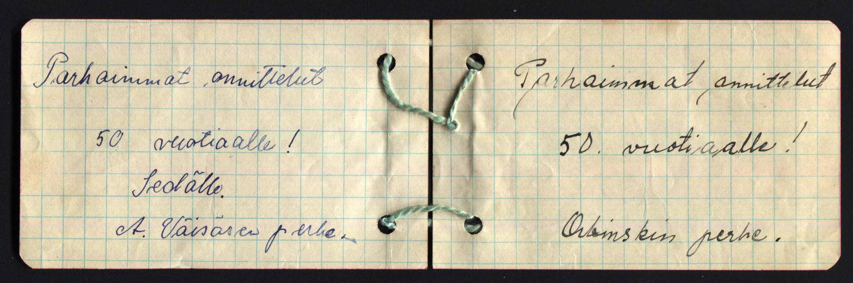 Päivän kuluessa sai hän vastaanottaa lukuisasti onnitteluja edustajatovereiltaan, Pälkjärven kunnalta, työv.järjestöiltä ja yksityisiltä ystäviltä. Sähkeitä ja onnittelukirjelmiä osoitettiin myös eduskuntaan. jossa V. tänään eduskunnan alkaessa työnsä on ne tilaisuudessa avaamaan.