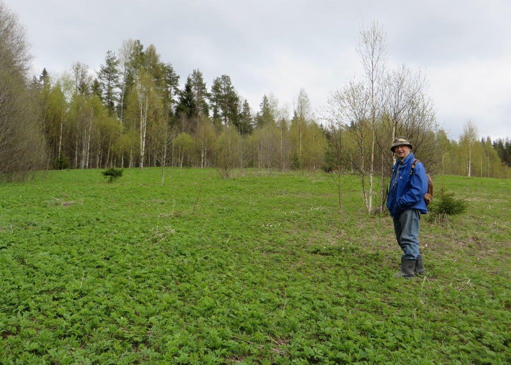 Entinen naapuri Paavo Immonen saapumassa Viistolan Immoseen. Talo on ollut aikanaan tuolla korkeiden puiden läheisyydessä. Pellot ovat viistosti talonpaikasta etelään. Siitäkö lie tullut tilan nimi Viistola? Kuva Lissu Kaivolehto.