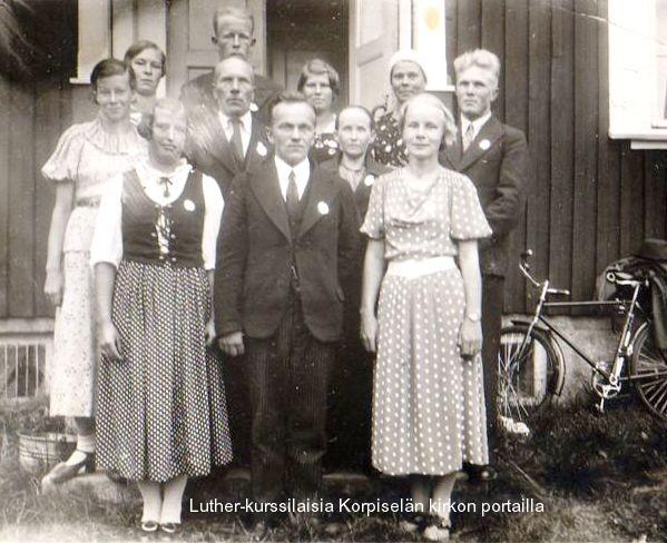 Luther-kurssilaiset retkellä Korpiselän kirkolla. Kuva Leena Parvelan albumista.