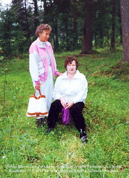 Pirkko Eronen (o.s. Asikainen) istuu samalla kotipihan kivellä Naatselässä, missä hänet kuvattiin äitinsä Aili Asikaisen sylissä vuonna 1942. Vieressä seisoo Annikki Tarvainen (o.s. Kokki). Kuvattu 17.7.1991. Kuva Pentti Asikaisen albumista.