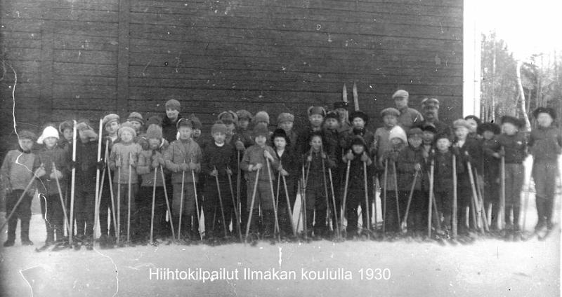Hiihtokilpailut Ilmakan koululla vuonna 1930. Takana opettaja Anni Kilpiranta.