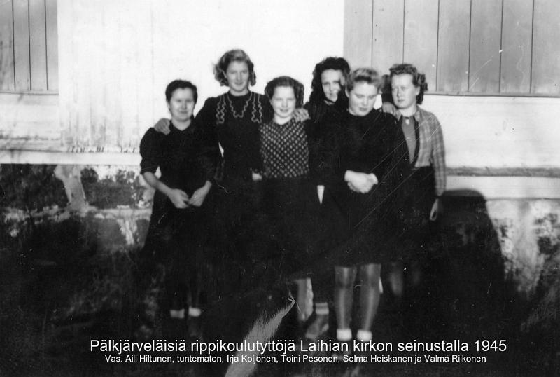 Kuvan kuusi pälkjärveläistyttöä aloittivat rippikoulunsa Laihialla syksyllä 1944. Vas. Aili Hiltunen, Aune Halonen, Irja Koljonen, Toini Pesonen, Salme Heiskanen ja Valma Riikonen. Kuva Aili Lehtosen o.s. Hiltunen albumista.