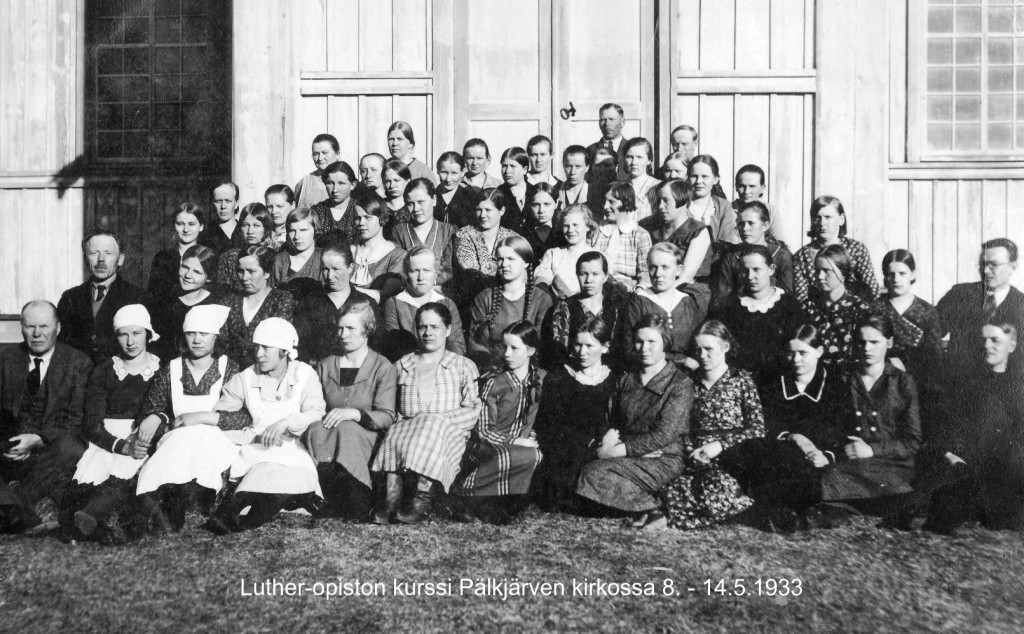 Luther-opiston kurssilaiset Pälkjärven kirkon edustalla. Kurssi pidettiin kirkossa 8-14.5.1933. Toinen rivi edestä vas. kanttori Martti Kilpiranta ja Aino Heinonen (myöh. Pesonen). Toisen rivin oik.reunassa rovasti Eino Sares.