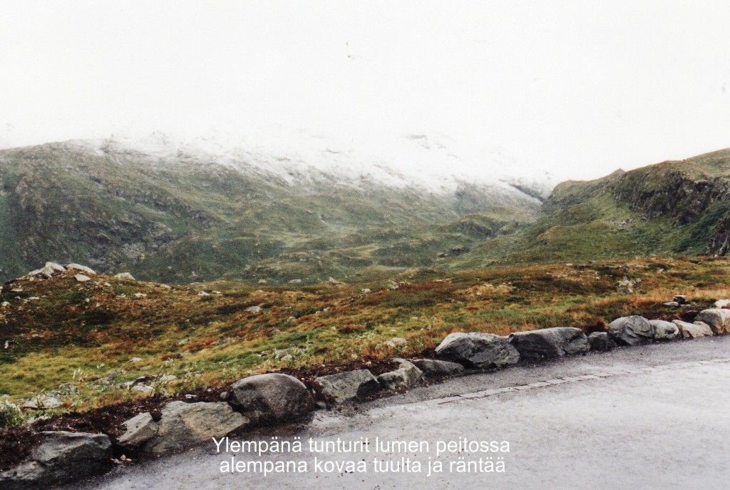 Ilmojen haltijat eivä kaikin ajoin suosineet Norjan matkalaisia 1997. Ylempänä olivat tunturit lumenpeitossa ja alempana oli kova tuuli ja satoi räntää. Kuva Unto Kortelainen.