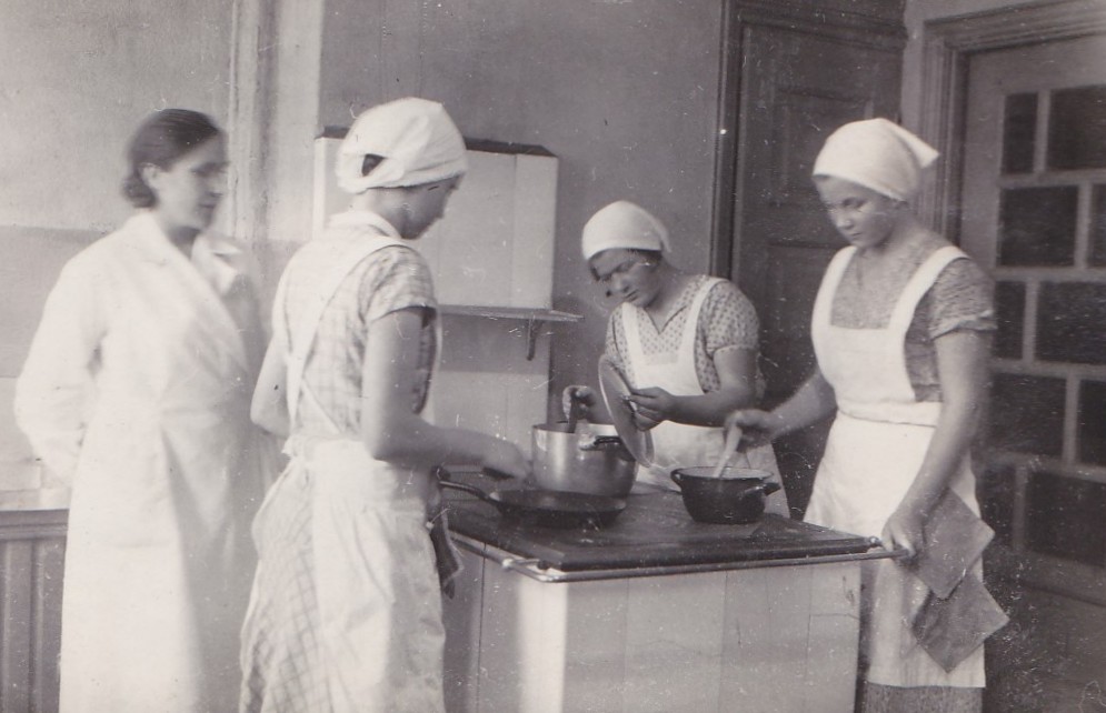 Ketä ja missä ovat nämä nuoret naiset hellan ääressä? Kuva on Ilmakassa 1914 syntyneen Hanna Tukiaisen (myöh. Huuhtanen) albumista.