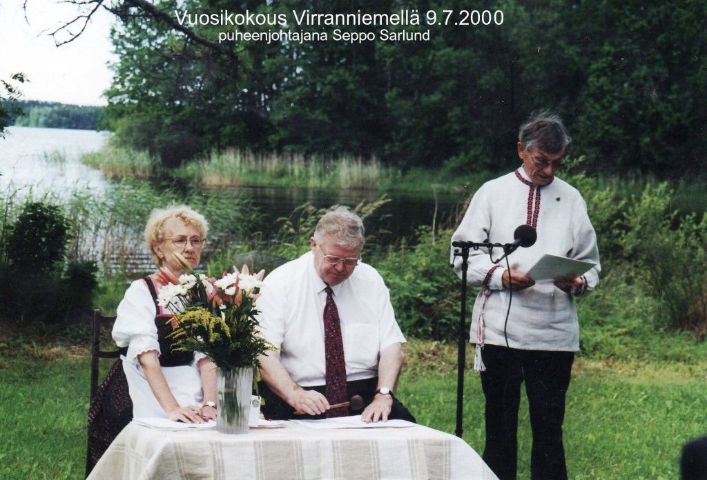 Vuonna 2000 seuran kesäjuhlia vietettiin heinäkuun yhdeksäntenä päivänä Maaningalla. Josefiina ja Aaro Sarlundin perilliset olivat kutsuneet pälkjärveläiset viettämään vuotuista kesäjuhlaa perikunnan kotiin Käärmelahden Virranniemelle teemana Maaningalle tulon 60-vuotismuistelut. Tulokahvien ja pihakirkon jälkeen oli vuorossa vuosikokous. Kokouksen puheenjohtajana toimi Seppo Sarlund ja sihteerinä Maija Närhi. Oikealla seisomassa Unto Kortelainen. Kuva Unto Kortelaisen albumista.