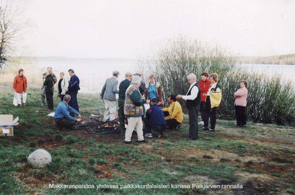 Matkalaisia makkaranpaistossa yhdessä paikallisten asukkaiden kanssa Pälkjärven rannalla Pälksaaressa valkovuokkomatkalla 1999. Kuva Unto Kortelainen.