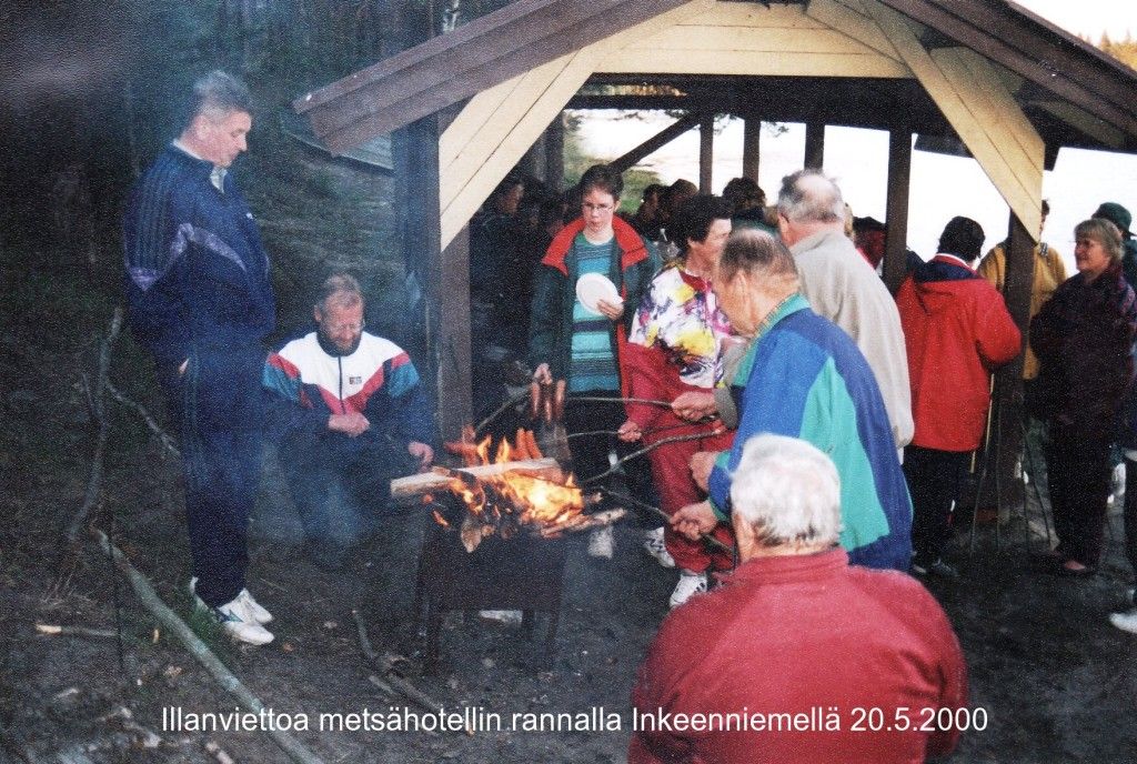 Makkaranpaistokin näyttää kuuluvan valkovuokkomatkan perinteisiin. Vuonna 2000 makkaraa paistettii Jänisjärven rannalla Inkeenniemellä. Kuva Unto Kortelainen.