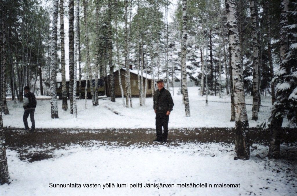 Herättyään sunnuntaiaamuna toukokuussa 2002 Inkeenniemen metsähotellissa valkovuokkomatkalaiset kokivat melkoisen yllätyksen - yön aikana maa oli peittynyt lumivaipan alle. Kuva Unto Kortelainen.