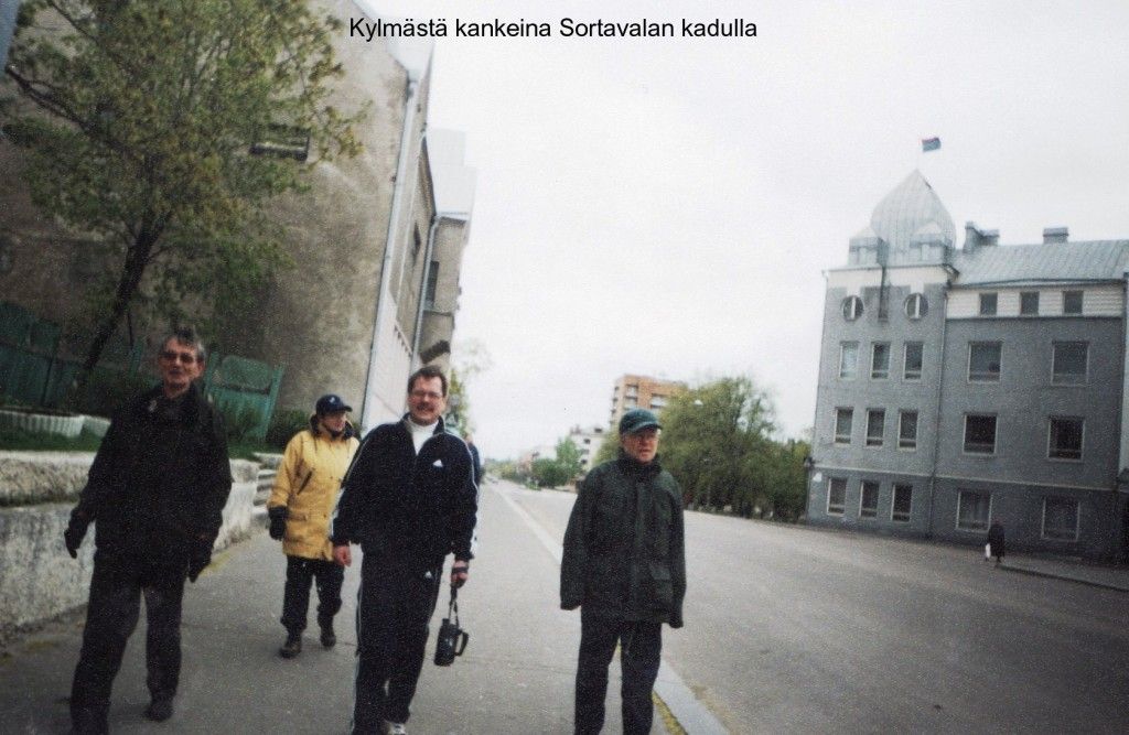 Valkovuokkomatkalaisia toukokuussa 2002 kylmästä kankeina Sortavalassa Karjalankadulla. Kuva Maija-Liisa Kortelainen.