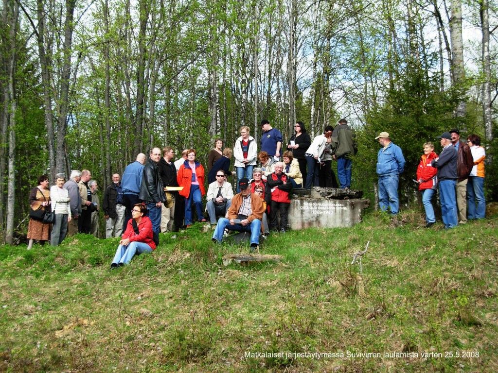 Valkovuokkomatkalaiset valmistautuvat veisaamaan perinteisen suvivirren kirkon portailla 25.5.2008. Kuva Unto Kortelainen.