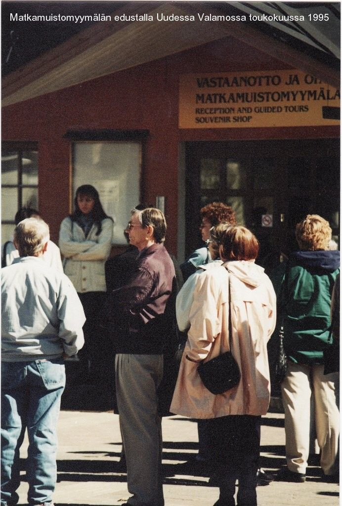 Retkeläiset matkamuistomyymälän edustalla Heinäveden Valamossa toukokuussa 1995. Kuva Unto Kortelaisen albumista.