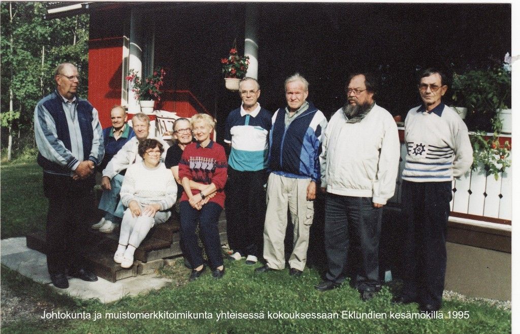 Johtokunta ja muistomerkkitoimikunta yhteisessä kokouksessaan Eklundien kesämökillä 1995. Henkilöt vas. Väinö Niskanen, Antti Juvonen, Martti Rouhiainen, Maire Rouhiainen, Lahja Eklund, Maija Närhi, Veikko Eklund, Pentti Asikainen, Rauno Hämäläinen ja Unto Kortelainen. Kuva Unto Kortelaisen albumista.