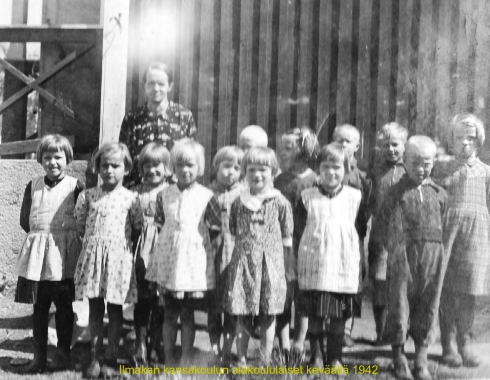 Ilmakan koulun alaluokkalaiset keväällä 1942. Vas. Helmi Muhonen, Maire Malinen, Lahja Leppänen, Annikki Niiranen, Iida Kosonen, Eila Rouhiainen, Esa Rouhiainen (takana), Aune Kortelainen (pää käännettynä sivulle), Hilja Muhonen, Pertti Nousiainen, Väinö Kortelainen, Pentti Halonen ja Ritva Köhlin Taustalla opettaja Kerttu Pailamo.