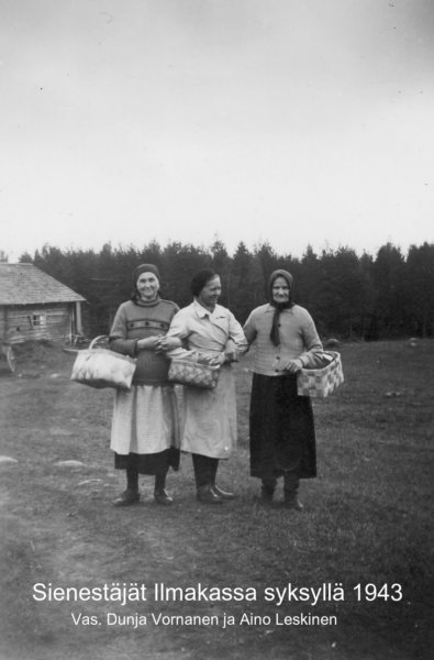 Sienestäjiä Ilmakassa syksyllä 1943. Vas. Dunja Vornanen ja keskellä Aino Leskinen.