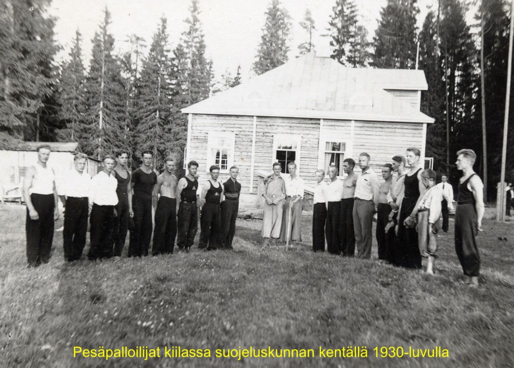 Pesäpalloilijat kiilassa suojeluskunnan talon kentällä 1930-luvulla.