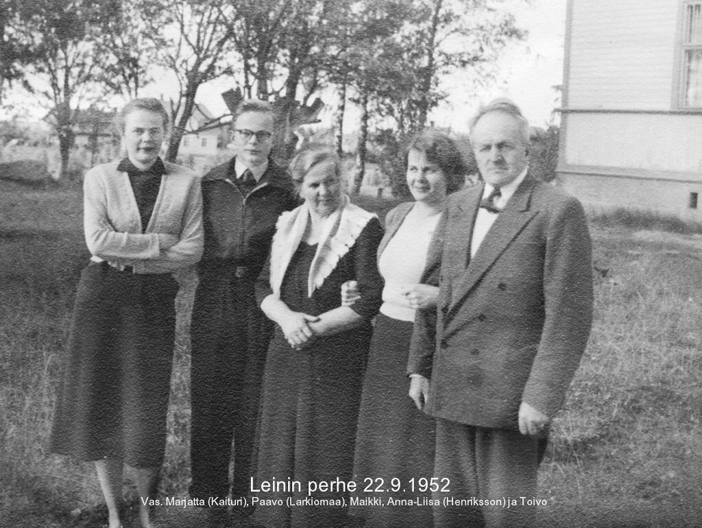Leinin perhe kuvattuna 22.9.1952. Vas.Marjatta (Kaituri), Paavo (Larkiomaa), Maikki, Anna-Liisa (Henriksson) ja Toivo. Mikähän mahtanee olla kuvauspaikka?