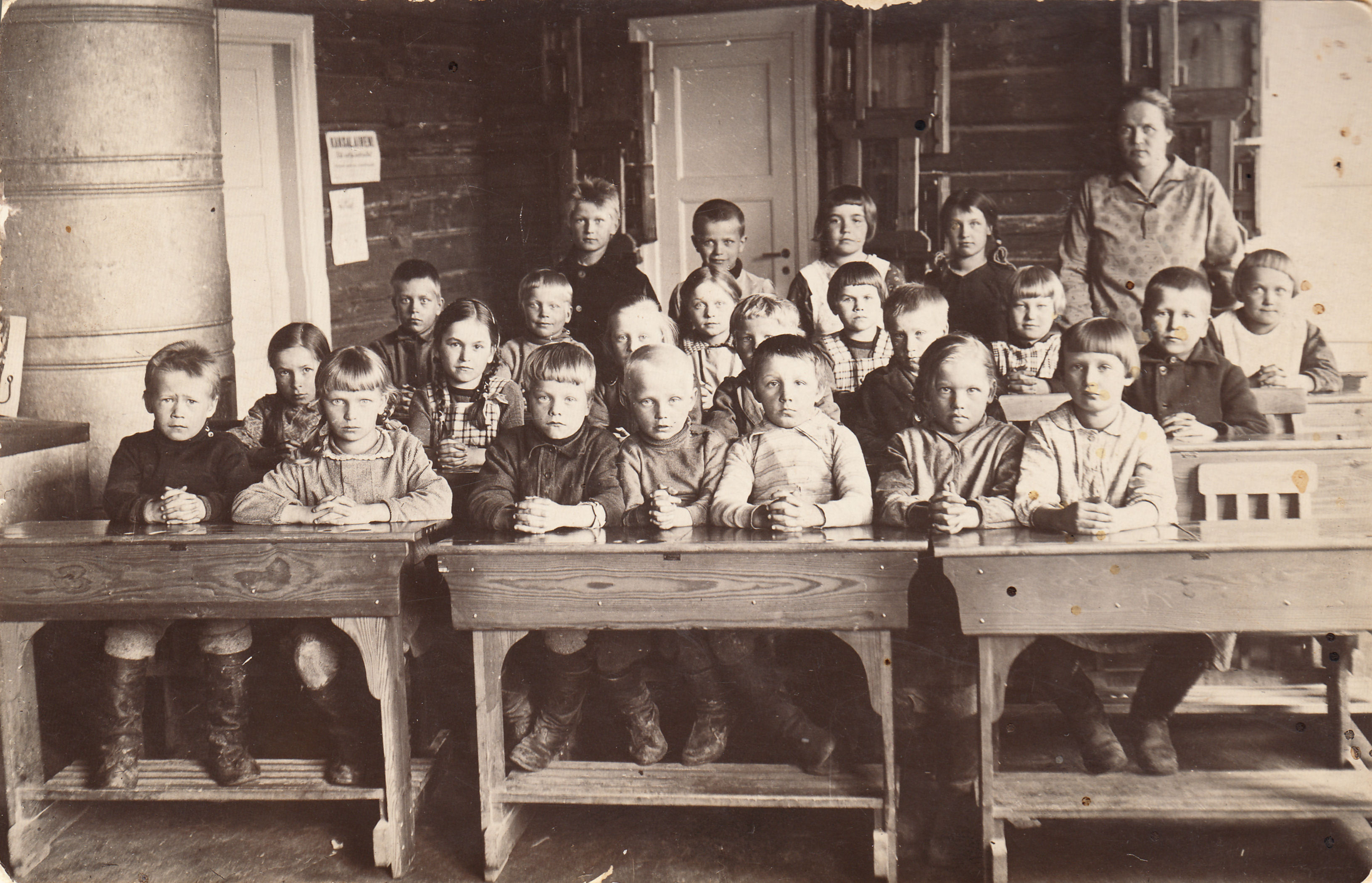Opettaja Kerttu Pailamo ja pienet alakoululaiset (syntymävuosi 1921-1922) Ilmakan koululla. Takarivissä 3. vas. Ulla Lahtinen (ns. kanttorin Ulla), seuraava rivi: 4. vas. (Ullan edessä) Aune Muhonen, seuraava rivi 2. vas. Aino Muhonen, eturivi 1. vas. Benjam (Penna) Nousiainen. Kuva Anja Laineen albumista.