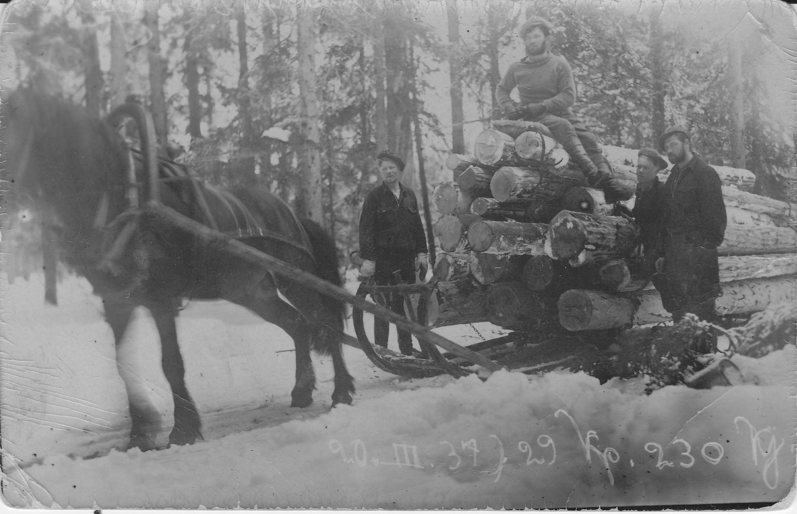 Naatselkäläinen Eino Pesonen (kuorman päällä) savotassa 20.3.1937. Kuva Maija Varosen albumista.