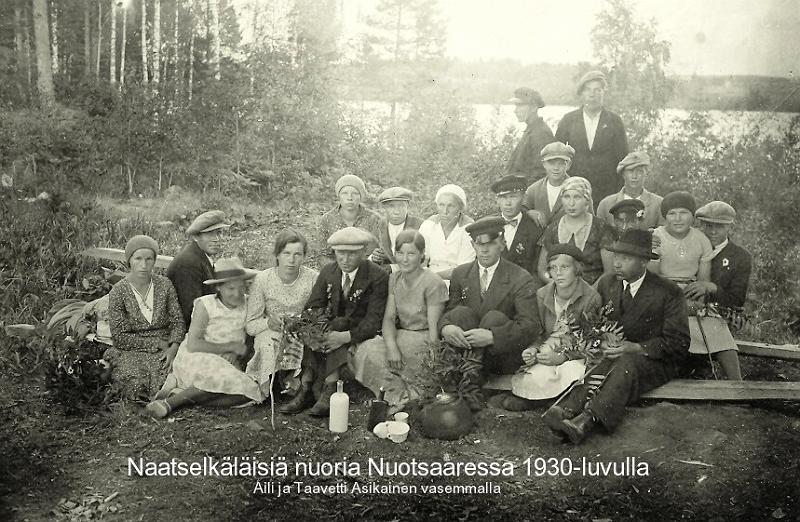 Naatselän nuoria lauantai-iltaa viettämässä. Nuotsaaressa 10.7.1937. Vas. Aili (o.s. Tarvainen) ja Taavetti Asikainen, Hilja Rummukainen (o.s. Asikainen), Helvi Heinonen ja Eino Pesonen.Einon oikealla puolella istuvan tytön toisella puolella istuu Eino Hämäläinen (kiiltävälippainen lakki päässä) ja hänen takanaan Hemmi Hämäläinen (rusetti kaulassa). Edessä oikealla Matti Heinonen.Baskeripäinen nainen Matin takana on Elsa Immonen Makariista. Kuva Pentti Asikaisen albumista.