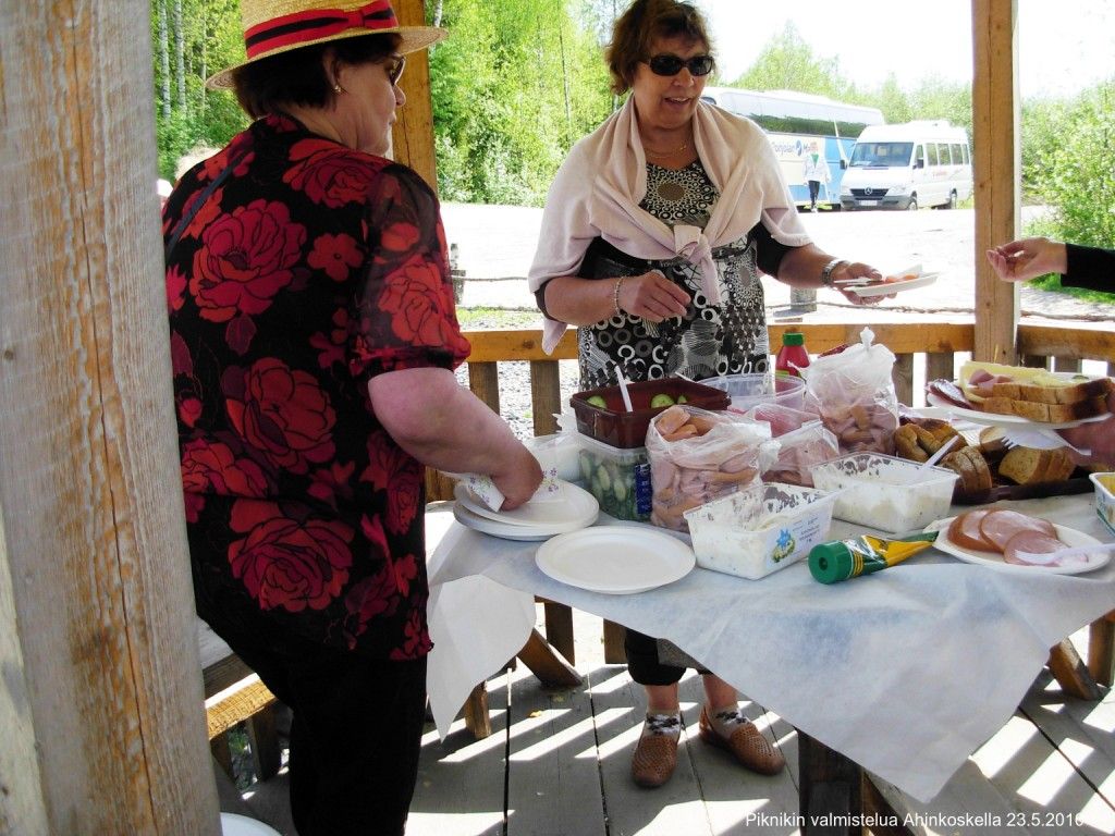 Touhukkaat emännät Anja ja Mirja valmistelemassa retkiateriaa matkalaisille Ahinkoskella 23.5.2010. Kuva Unto Kortelainen.